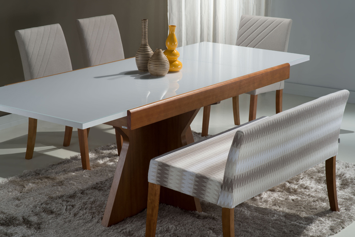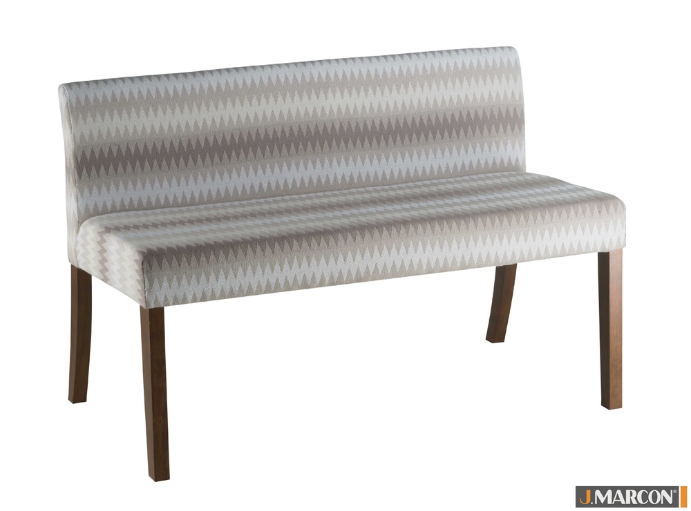 Banco Evidence com estrutura em madeira maciça de eucalipto e assento/encosto estofado com espuma de boa densidade e revestido com tecido.