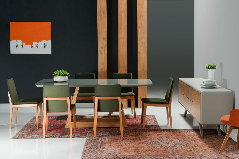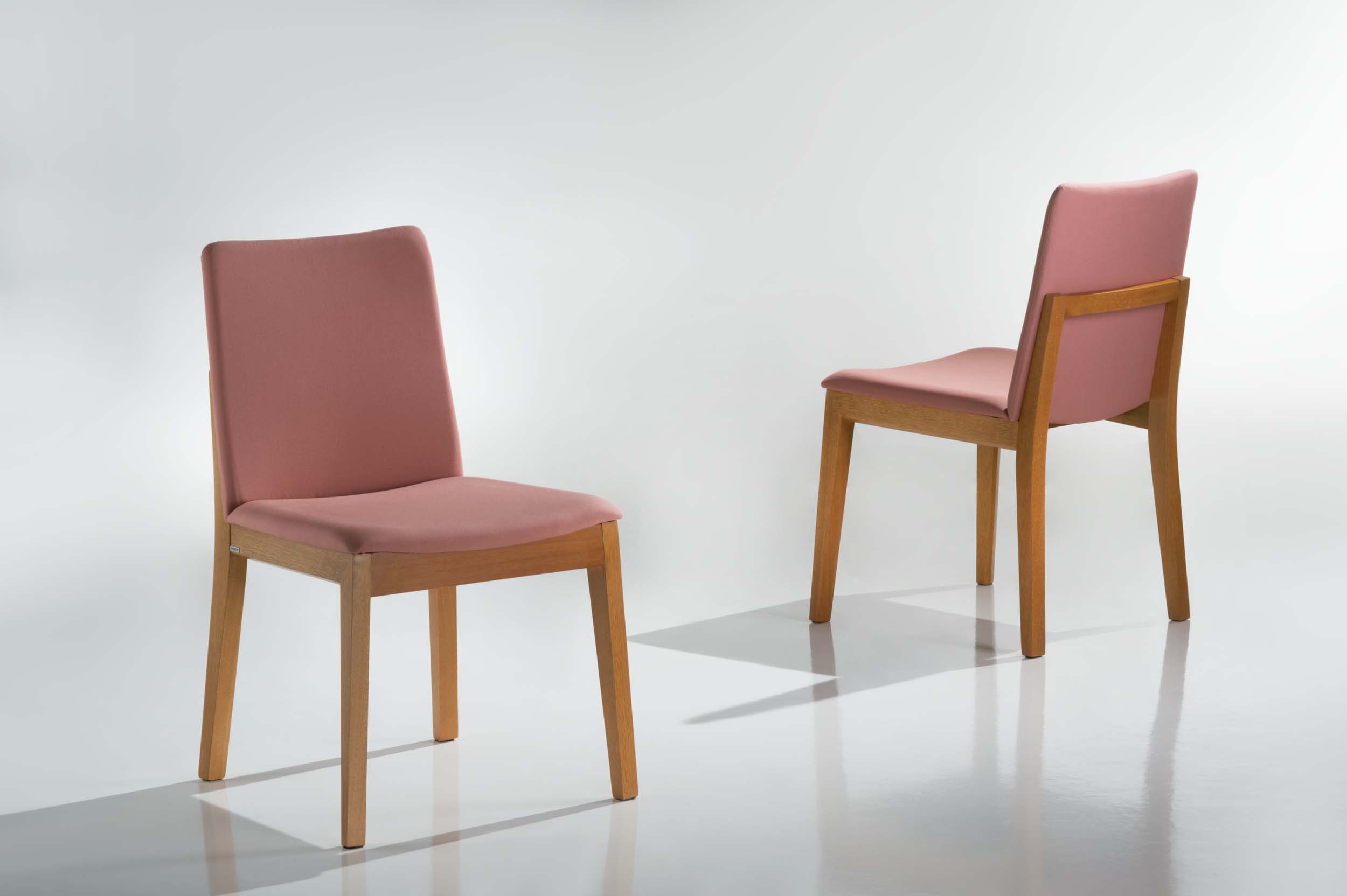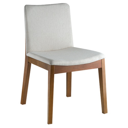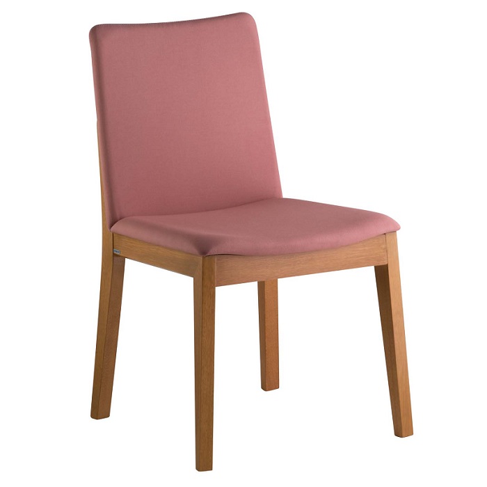 Cadeira Bella com estrutura em madeira maciça de eucalipto e assento/encosto estofado com espuma de boa densidade e revestido com tecido.