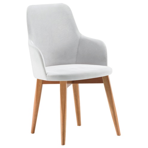 Cadeira Dora com estrutura em madeira maciça de eucalipto e concha em MDF ergonômico estofada com espuma de boa densidade e revestida com tecido.
