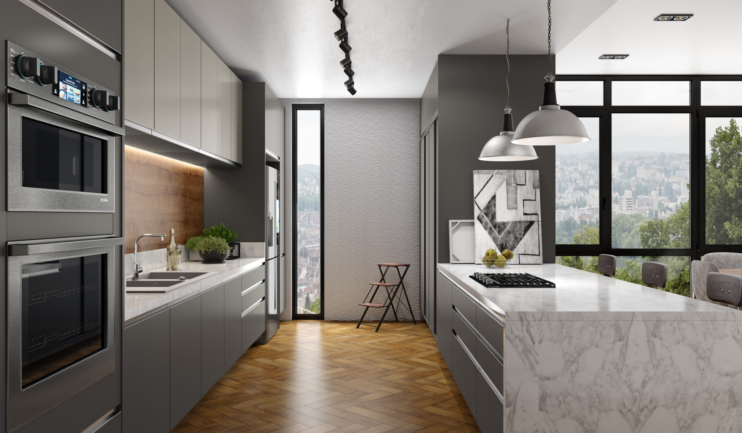 A elegância de uma cozinha que pode parecer séria, mas com detalhes em madeira entrega conforto e leveza.