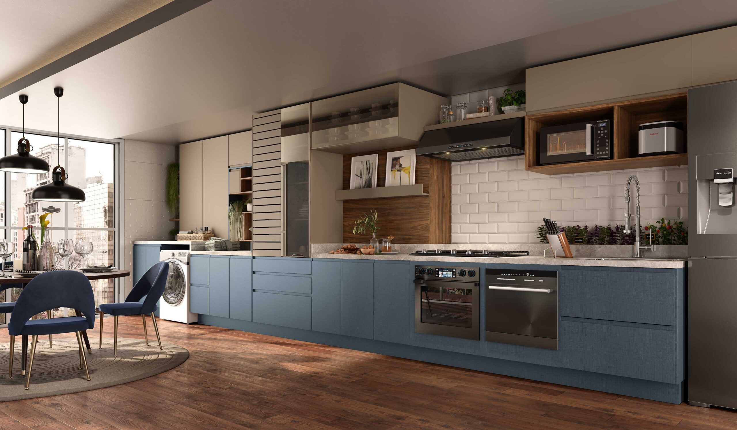 Design e funcionalidade em um ambiente que reúne cozinha + lavandeira.