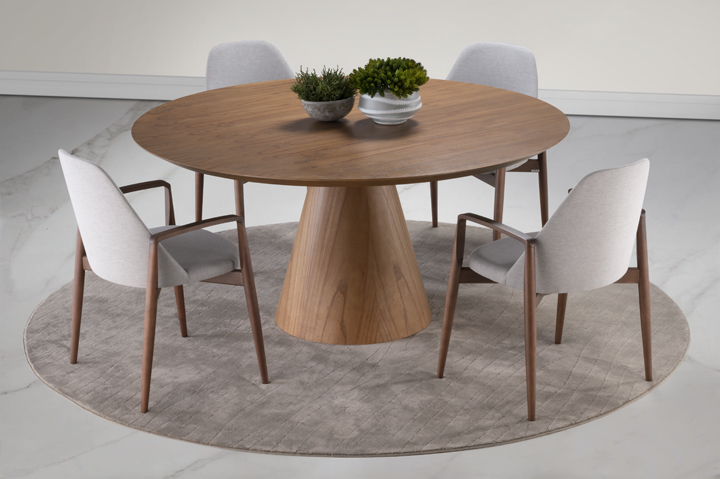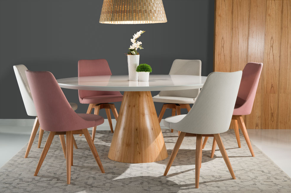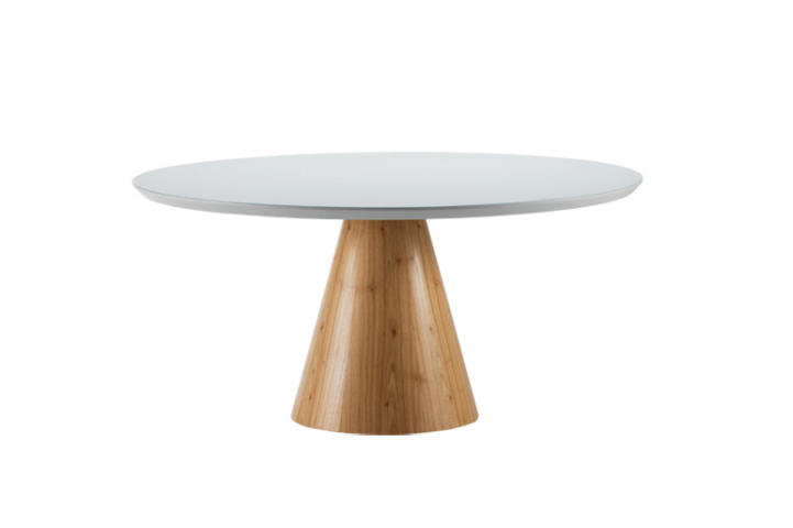 Mesa Bianca com tampo em MDF no sistema tamburato (painel semi-oco, composto na parte externa por 2 chapas de MDF, coladas e prensadas sobre uma estrutura interna) com espessura de 40mm com bordas usinadas com chanfro em 60° que apresenta um efeito de “borda infinita”. Na parte superior do tampo o acabamento pode ser com vidro colado ou laminado madeira. A base é produzida em compensado laminado madeira ou fibra de vidro quando os acabamentos são laca ou microtextura.