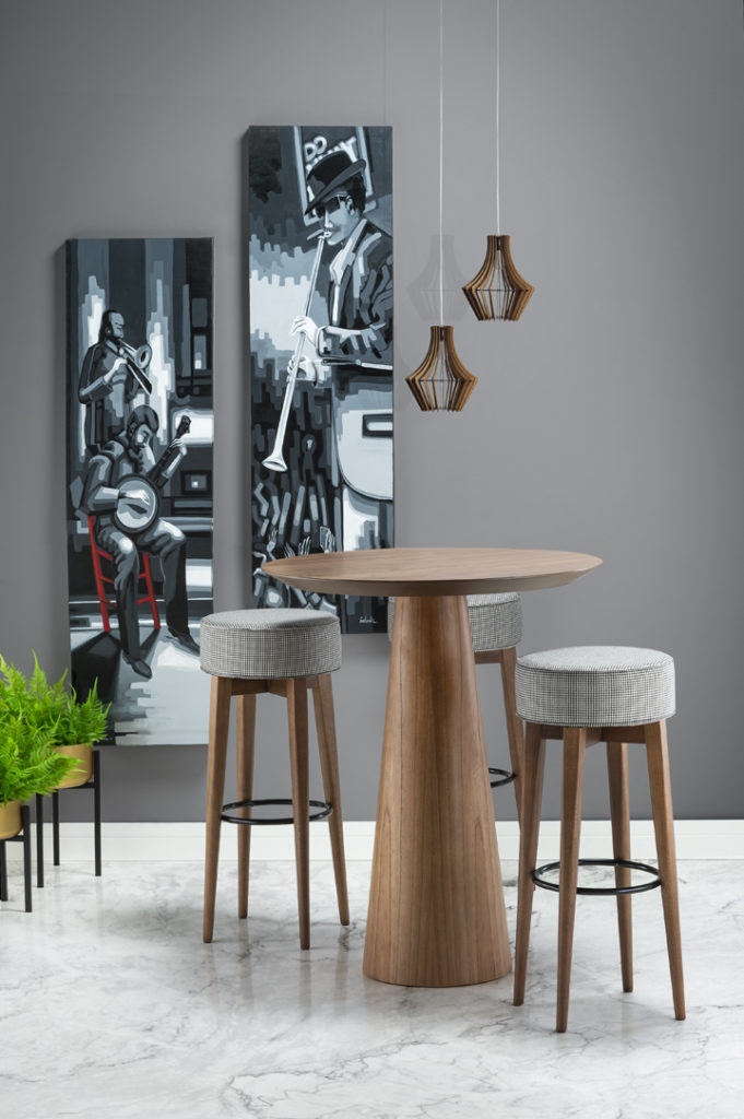 Tampo em MDF no sistema tamburato (painel semi-oco, composto na parte externa por 2 chapas de MDF, coladas e prensadas sobre uma estrutura interna) com espessura de 40mm com bordas usinadas com chanfro em 60° que apresenta um efeito de “borda infinita”. Na parte superior do tampo o acabamento pode ser com vidro colado ou laminado madeira. A base é produzida em compensado laminado madeira ou fibra de vidro quando os acabamentos são laca ou microtextura.
