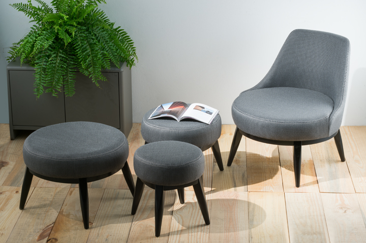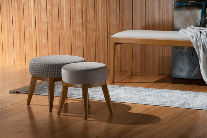 Estrutura em madeira maciça de eucalipto e assento em MDF estofado com espuma de boa densidade e revestida com tecido.
